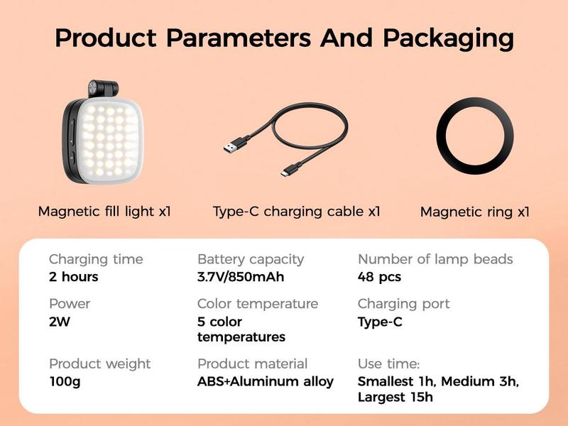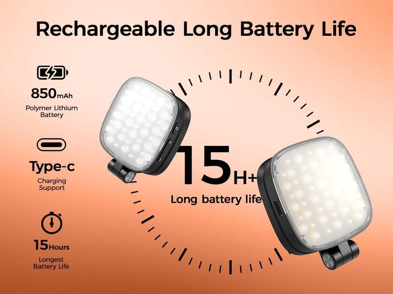 850mAh lithium polymer battery with USB-C charging (2-hour full charge). Run time: 1.5 hours at max brightness, 3 hours at medium, and up to 15 hours at low—perfect for Facebook, YouTube, TikTok content creation, selfies, makeup tutorials, and live streaming.