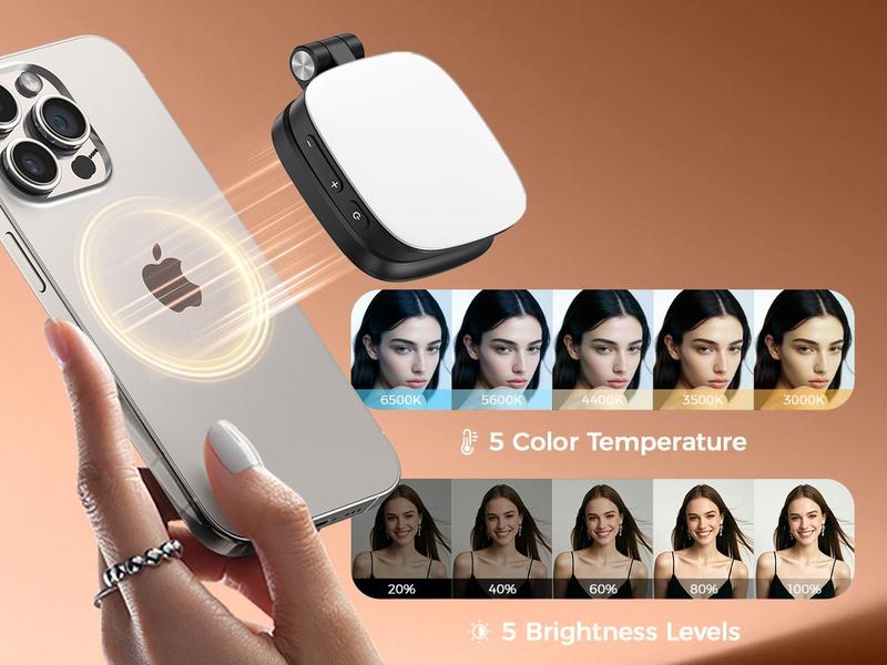 5 brightness levels (High Intensity, High, Medium, Low-Medium, Low) + 5 color temperatures (Cool Light, Cool Mix, Mixed Light, Warm Mix, Warm Light) enhance skin and eye details in photos/videos.